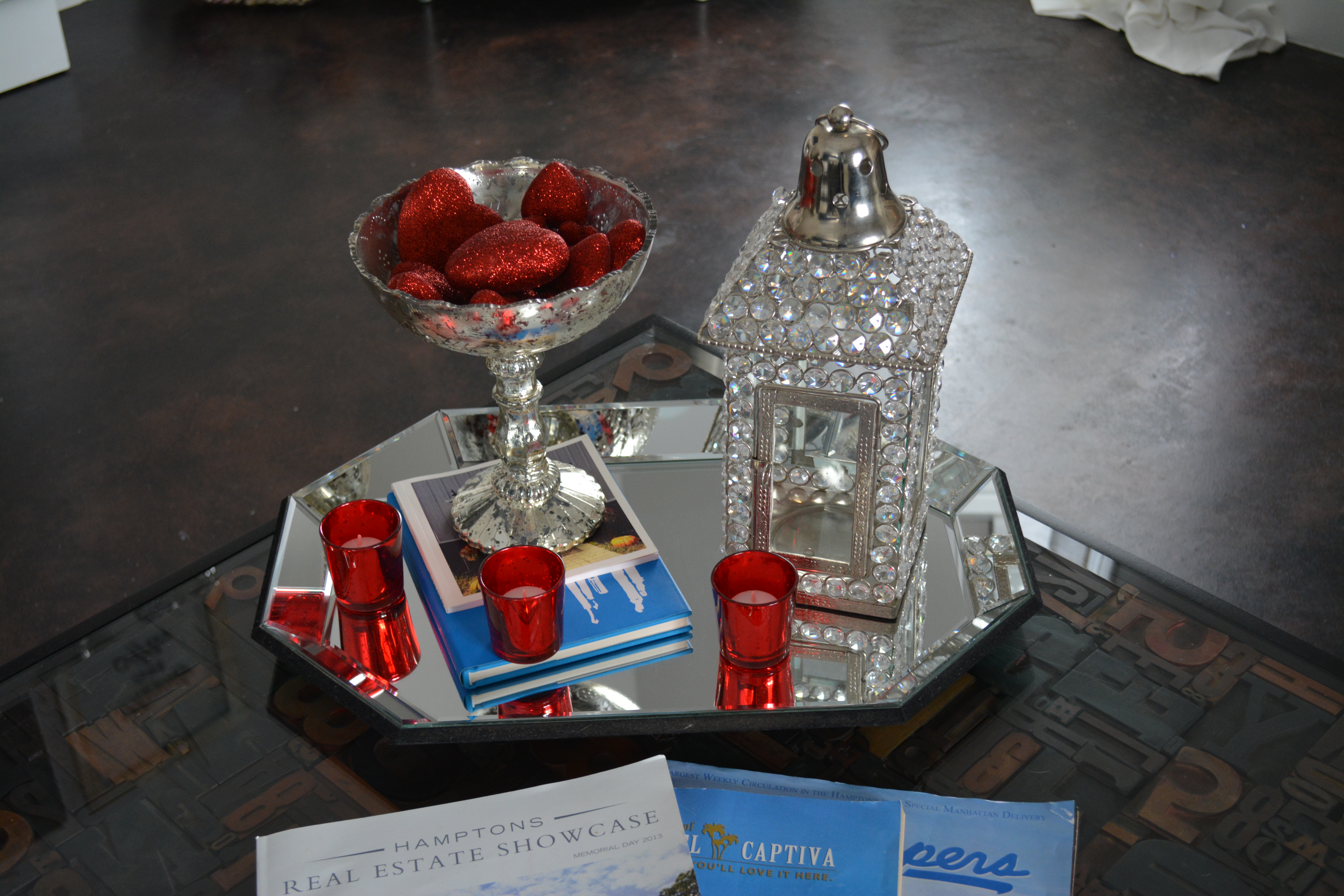 I found a bag of glittery hearts at Hobby Lobby, and put them in my mercury glass holder. I then used a few more red mercury glass votives to throw in a little more color.