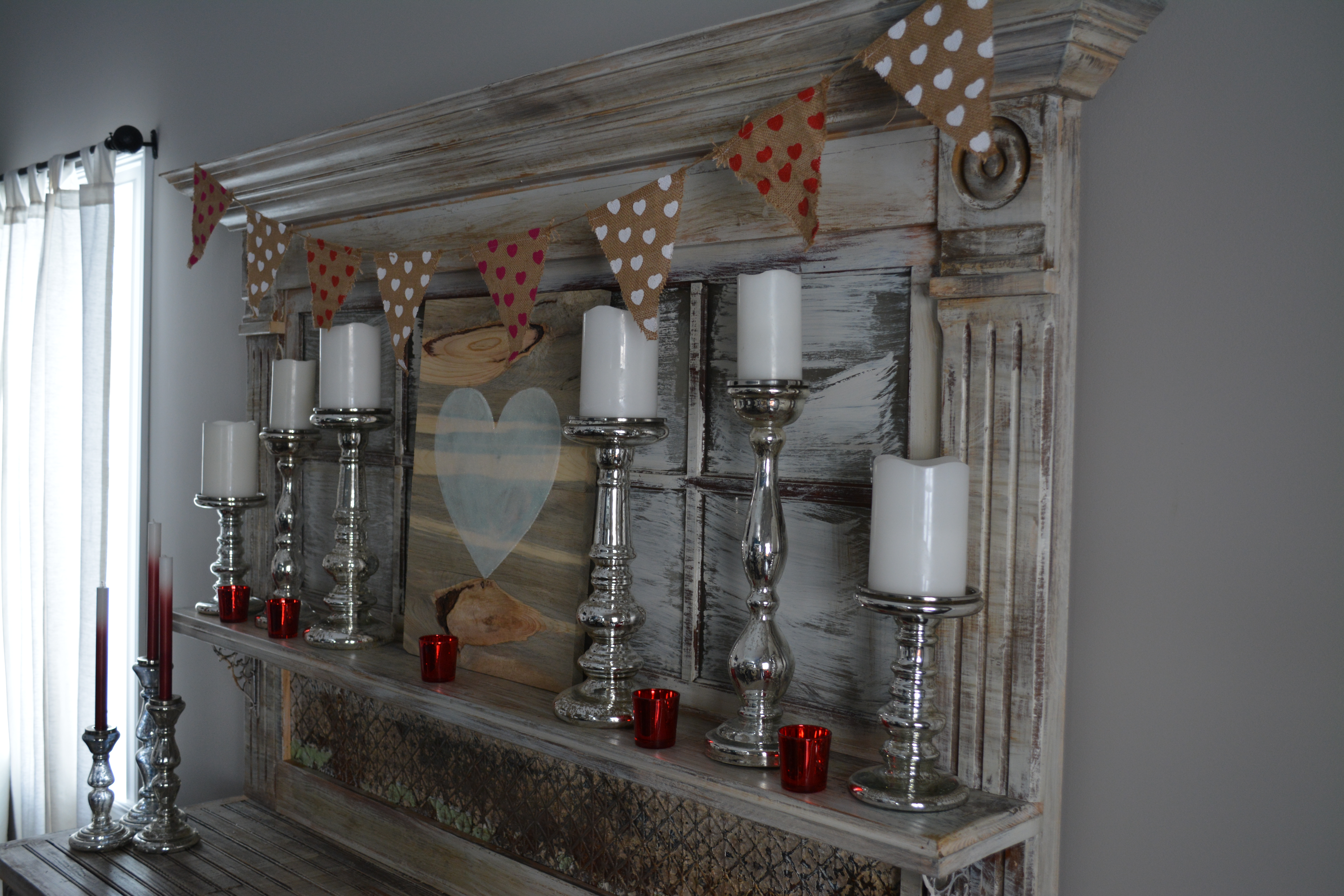 My hutch is my absolute favorite piece of furniture in our home. I just love how unique it is, and the decorating opportunities are endless. I used quite a bit of mercury glass again in this area, along with another banner from Target. I added in more candle sticks, and my DIY glitter heart sign.