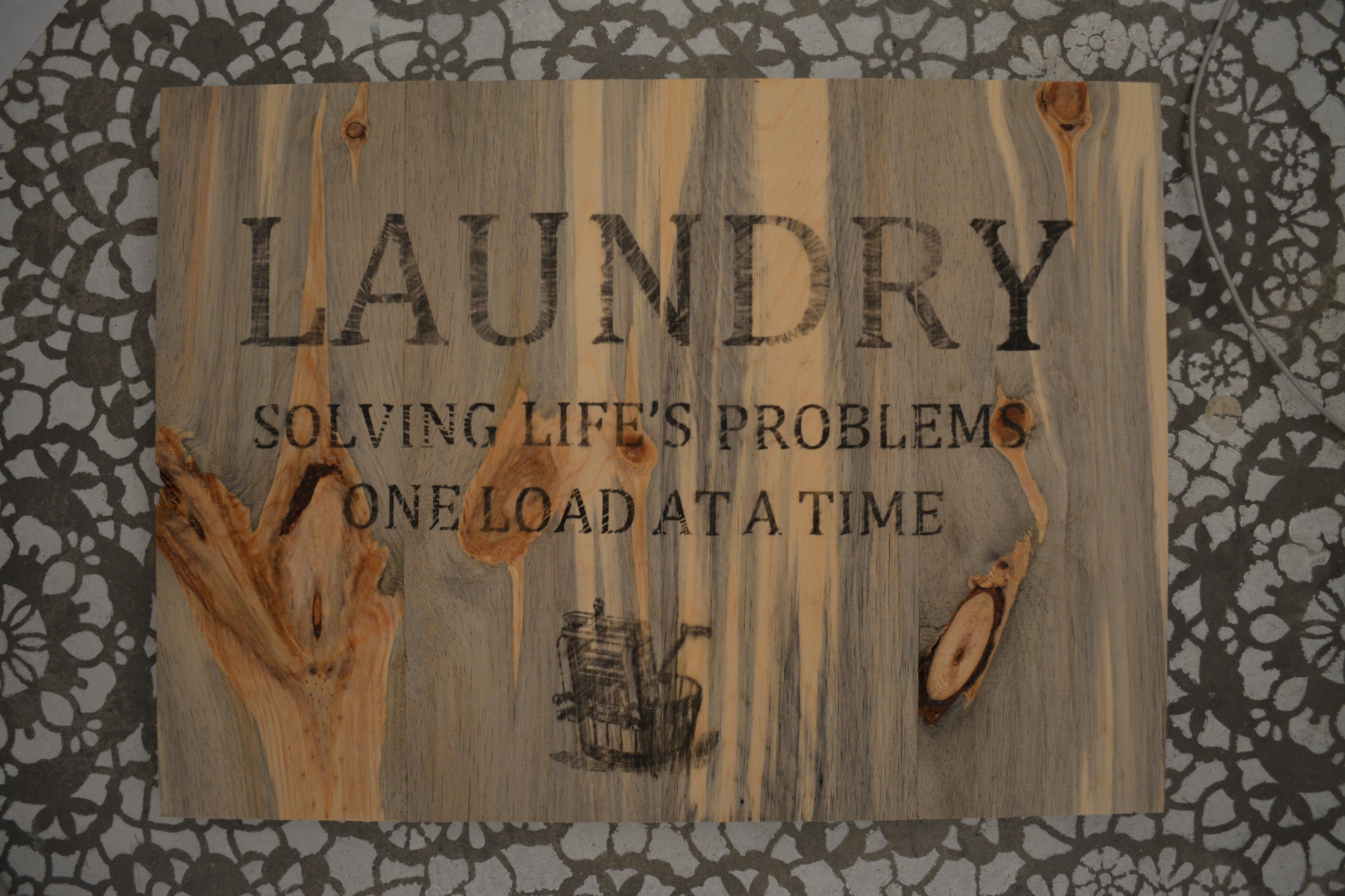 After a few minutes I pulled the paper off, and thankfully the letters turned out great! I was very nervous with this project because I really wasn’t sure how it would turn out. After transferring the lettering, I realized that there was still enough room at the bottom of my sign for an image. I found a picture of an old wringer, (it was difficult to find an all black image that I liked, but black ink seems to transfer much better than colored) and I added it – I think it was the perfect touch!