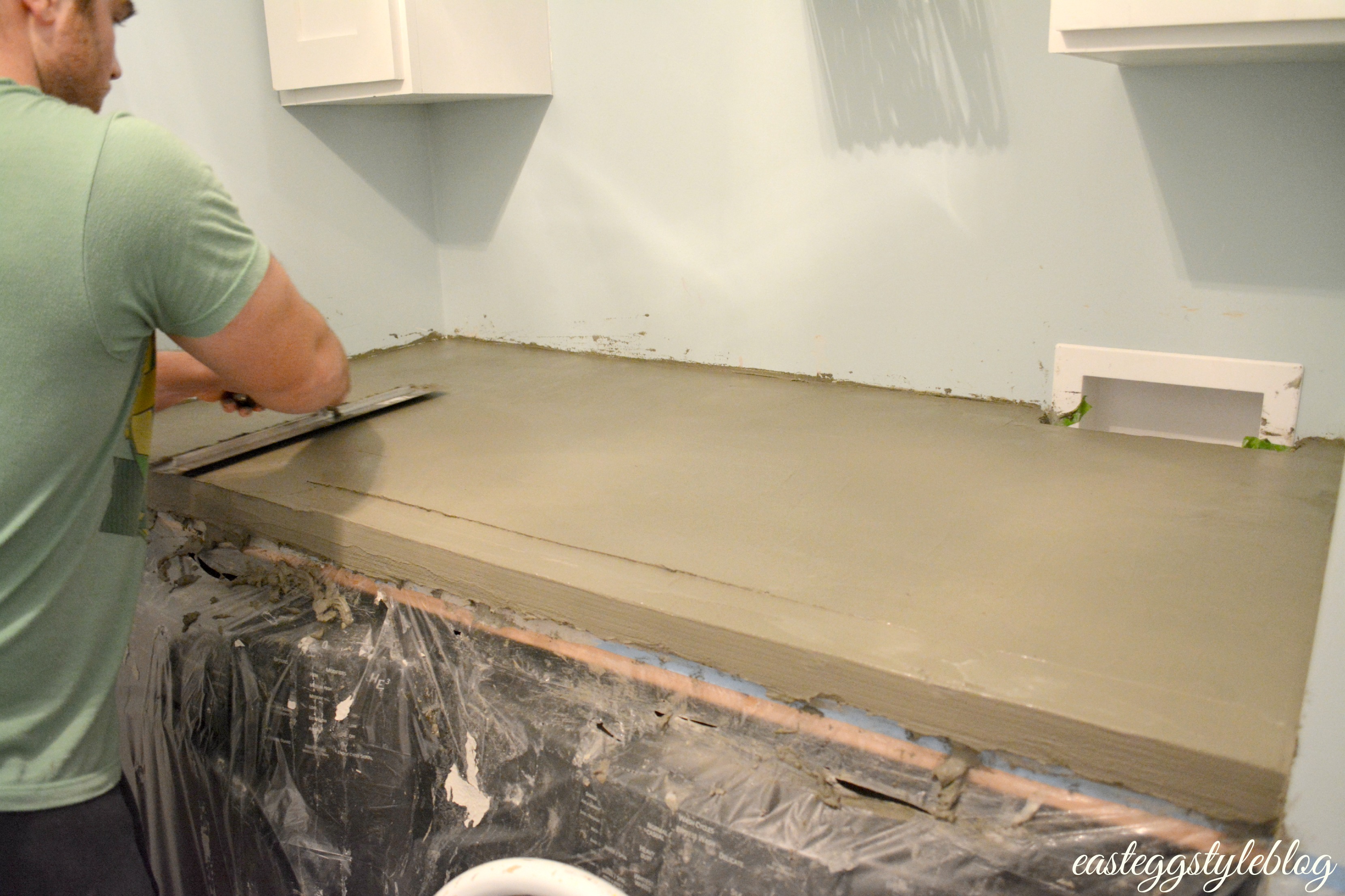 All of that being said, we also had some major concerns about attempting this project. Our first concern was the weight of the concrete. There are several ways to go at this project, but due to weight concerns, we built a base out of plywood first. After the base was installed, we added layers of cement. This process eliminated any concerns we had about weight (I had horrible visions of my counter ripping out of the wall and falling on my washer and dryer – yikes!).
