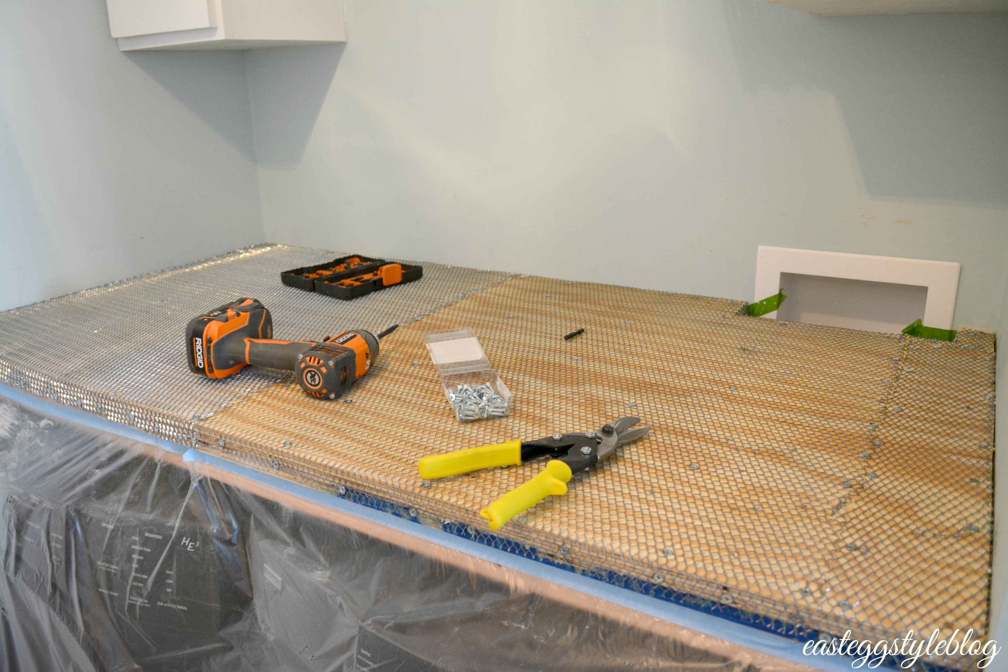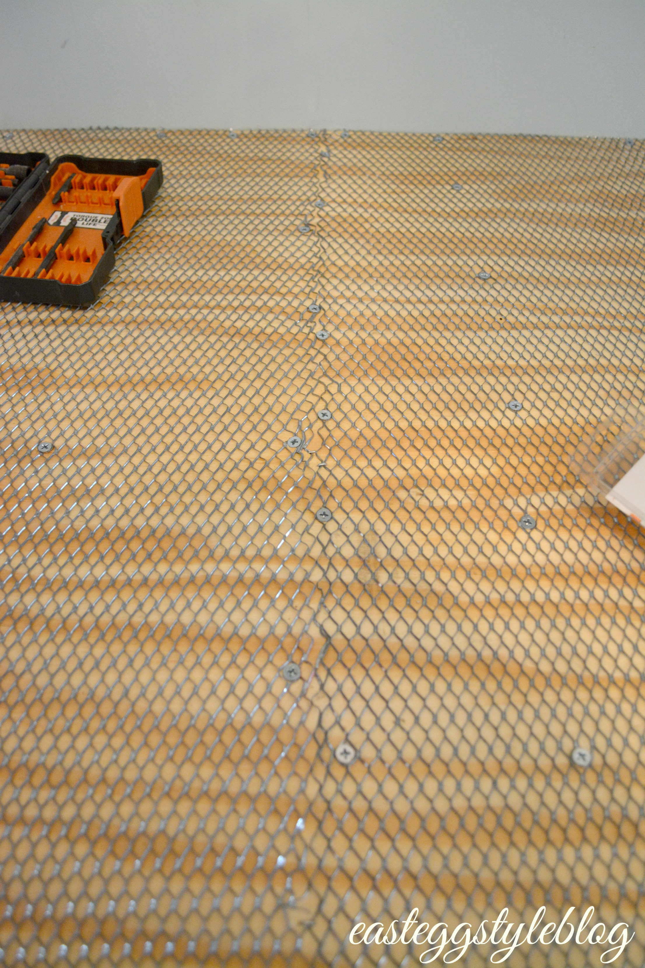 After both boards were cemented and screwed together, we put down a layer of metal mesh. We used more screws for this step, as well as a staple gun to tack down the corners.