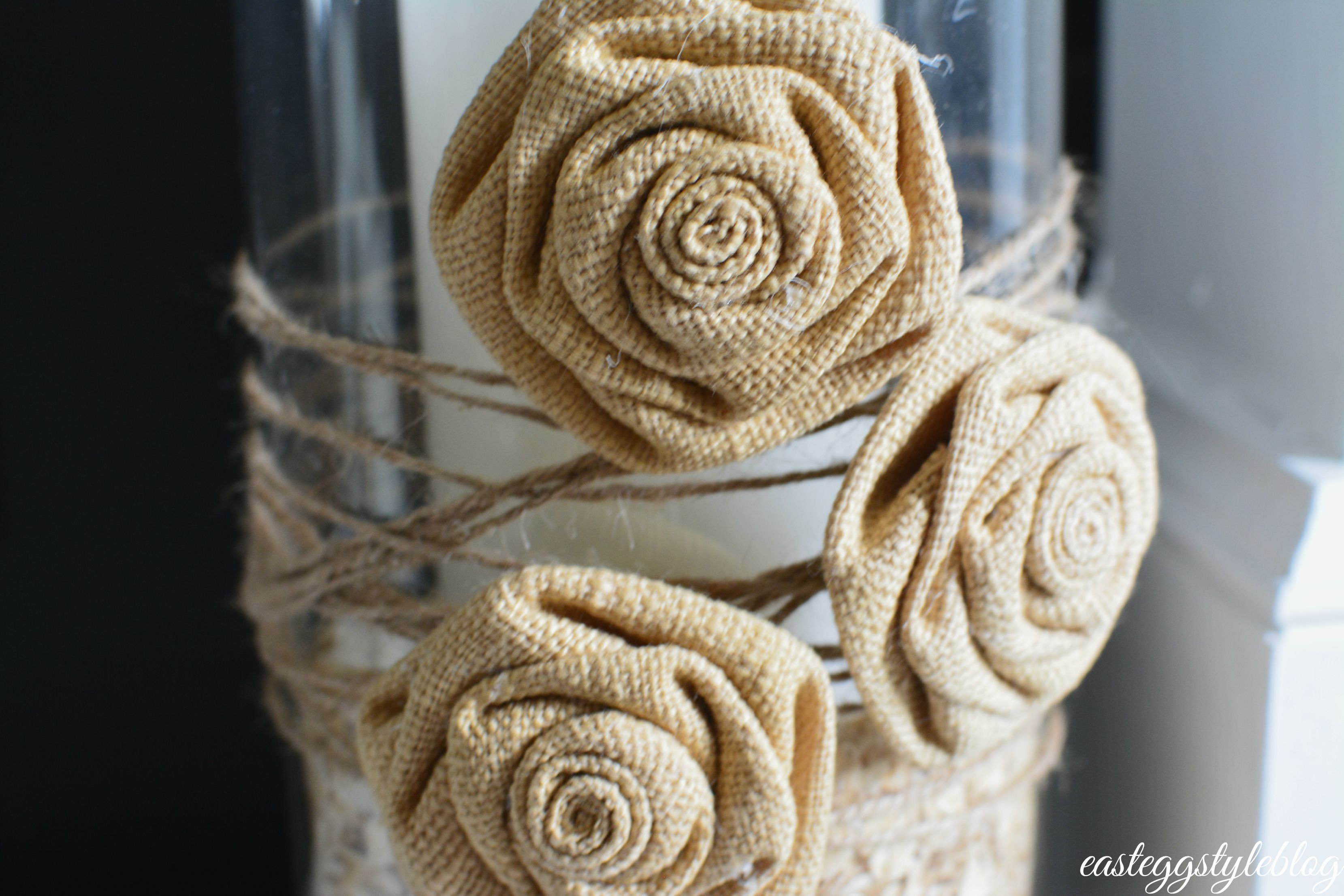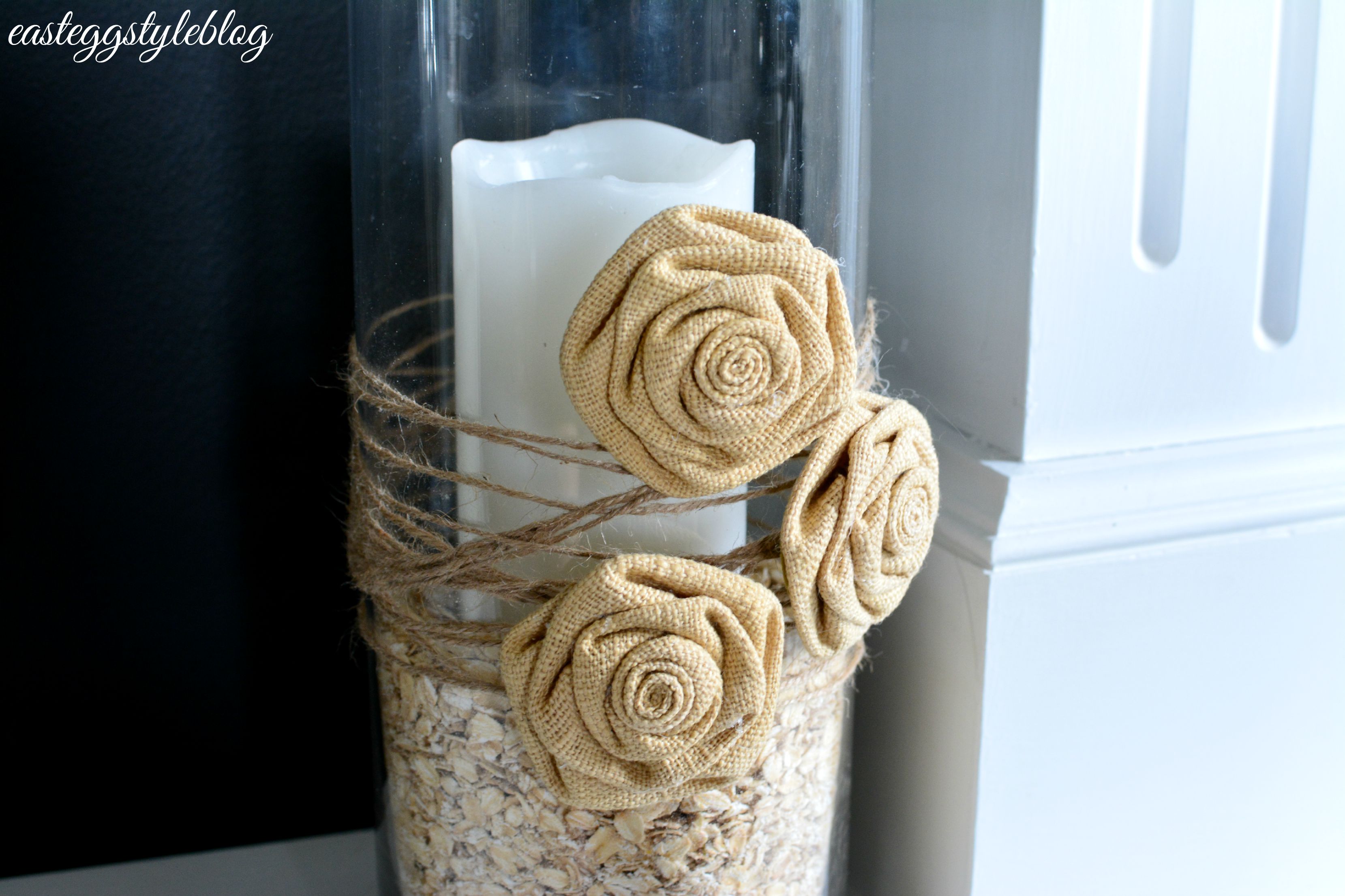 This week’s theme for our final #craftyfallyall project is glass! This little project cost me a total of $6 (I had everything except for the burlap flowers). I used glass hurricanes, oatmeal, twine and burlap flowers.
